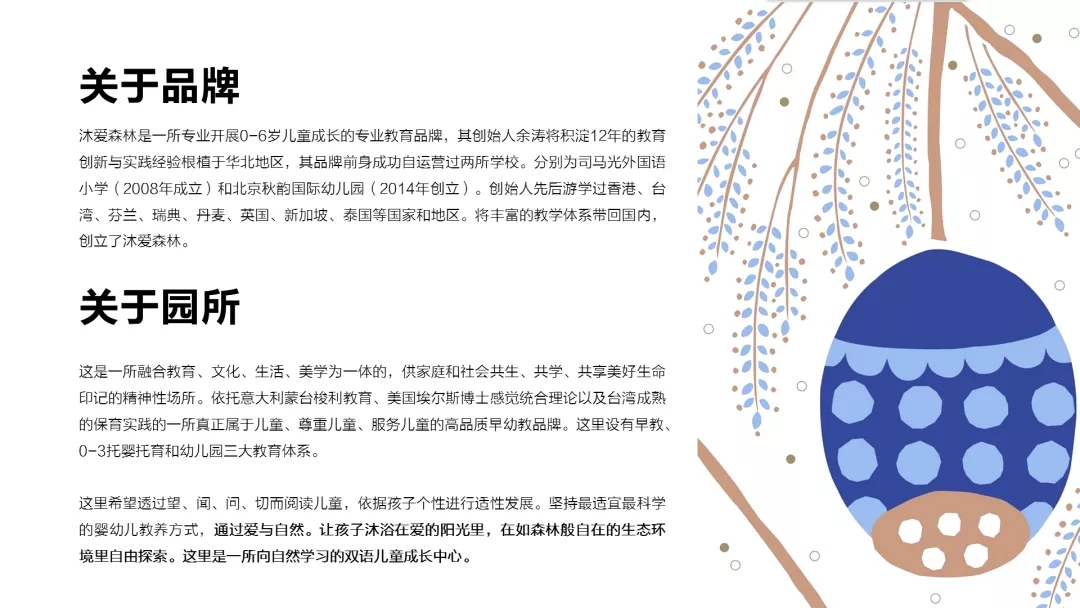 品牌背景:沐愛森林是一所專業(yè)開展0-6歲兒童成長的專業(yè)教育品牌,這是一所融合教育、文化、生活、美學為一體的,供家庭和社會共生、共學、共享美好生命印記的精神性場所。依托意大利蒙臺梭利教育、美國埃爾斯博士感覺統(tǒng)合理論以及臺灣成熟的保育實踐的高品質06早幼教品牌。這里設有母嬰商店、早教、0-3托嬰托育和幼兒園三大教育體系。