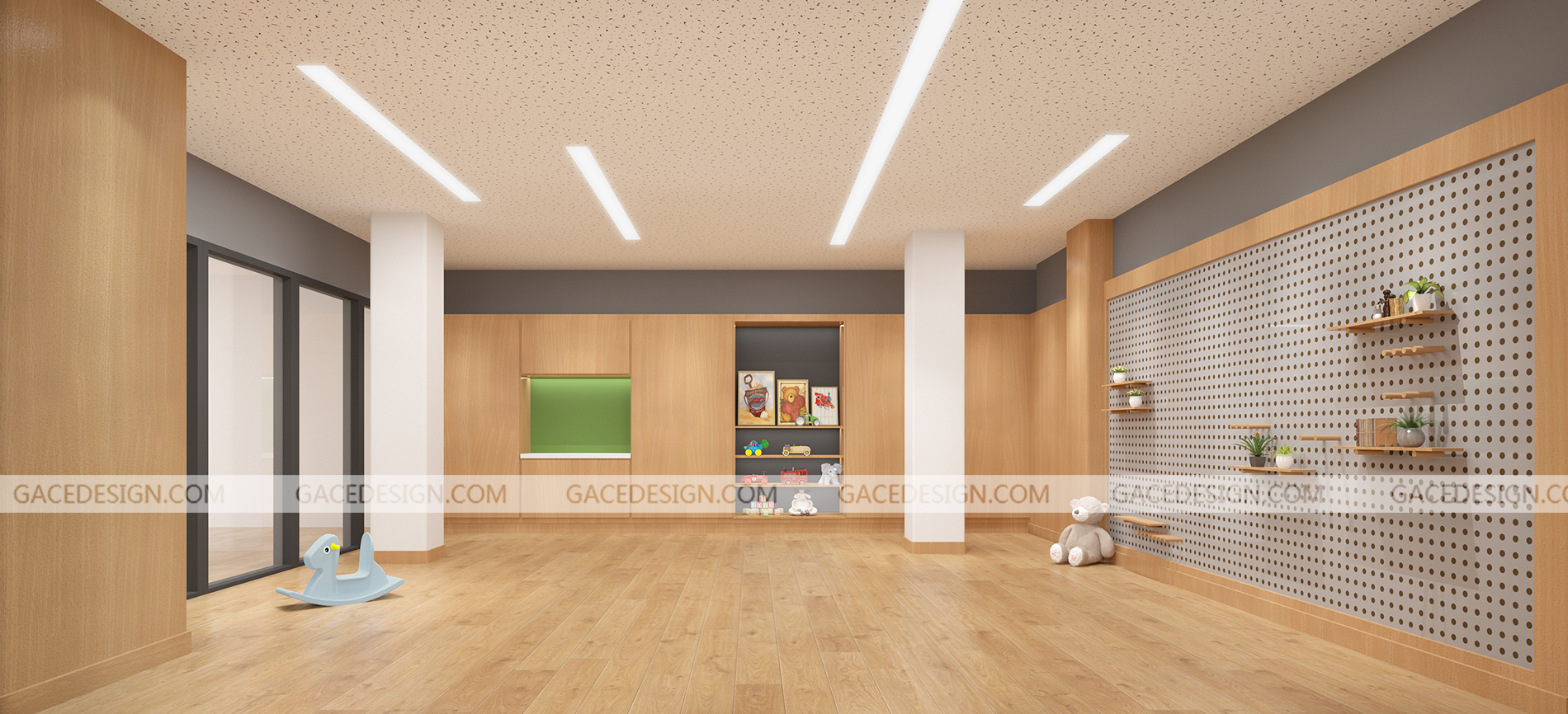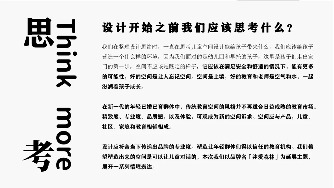 設計思考:在新一代的年輕群體中,傳統(tǒng)教育空間的風格并不再適合日益成熟的教育市場。精致度、專業(yè)度、品質感,以及體驗,可觀成為新的空間訴求??臻g應與產品,兒童、社區(qū)、家庭和教育相輔相成。設計應符合當下傳遞出品牌的專業(yè)度。塑造讓年輕群體們得以信任的教育機構。我們希望塑造出來的空間是可以讓兒童對話的,本次我們以品牌名「沐愛森林」為延展主題,展開一系列情境表達。
