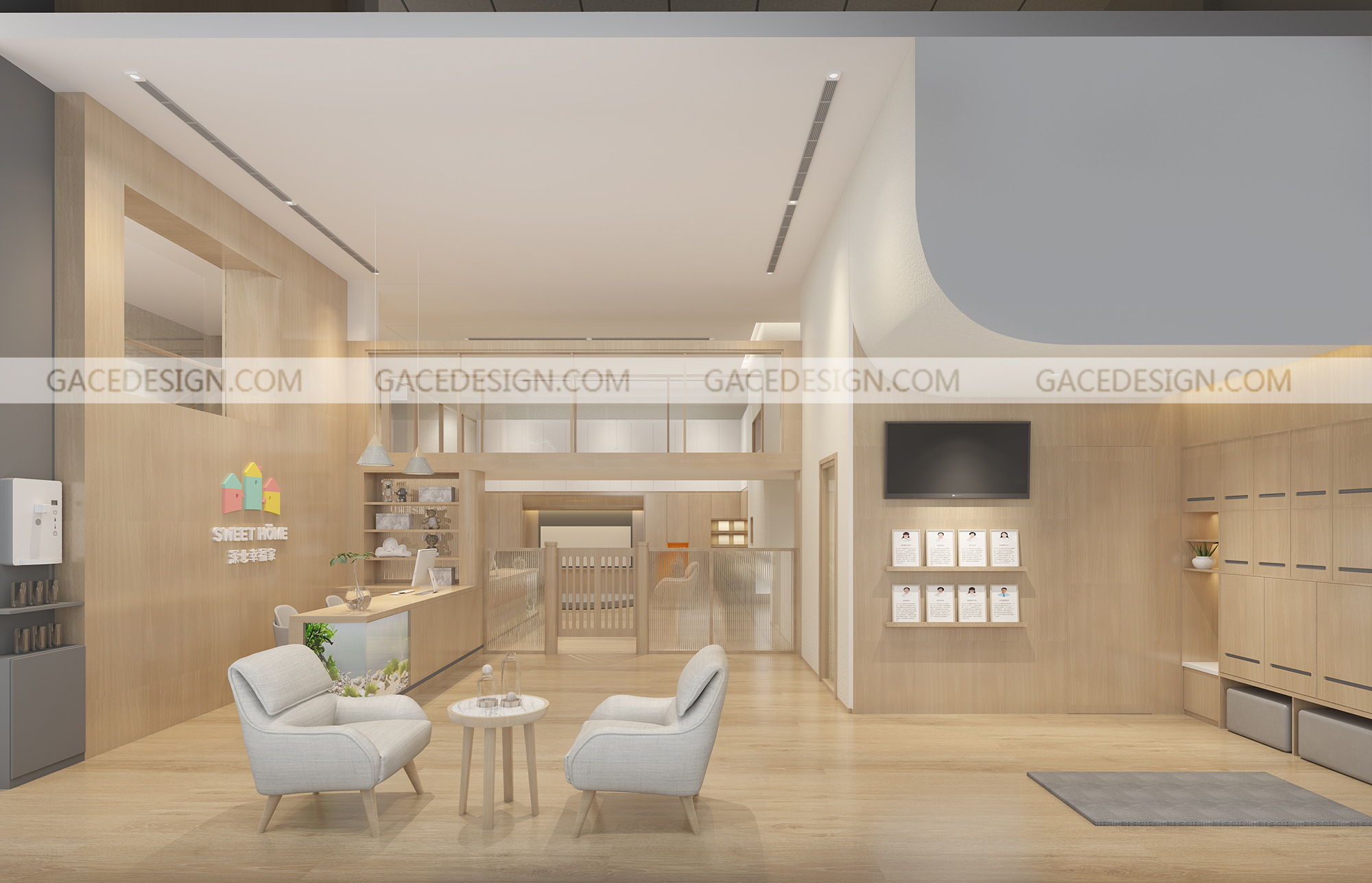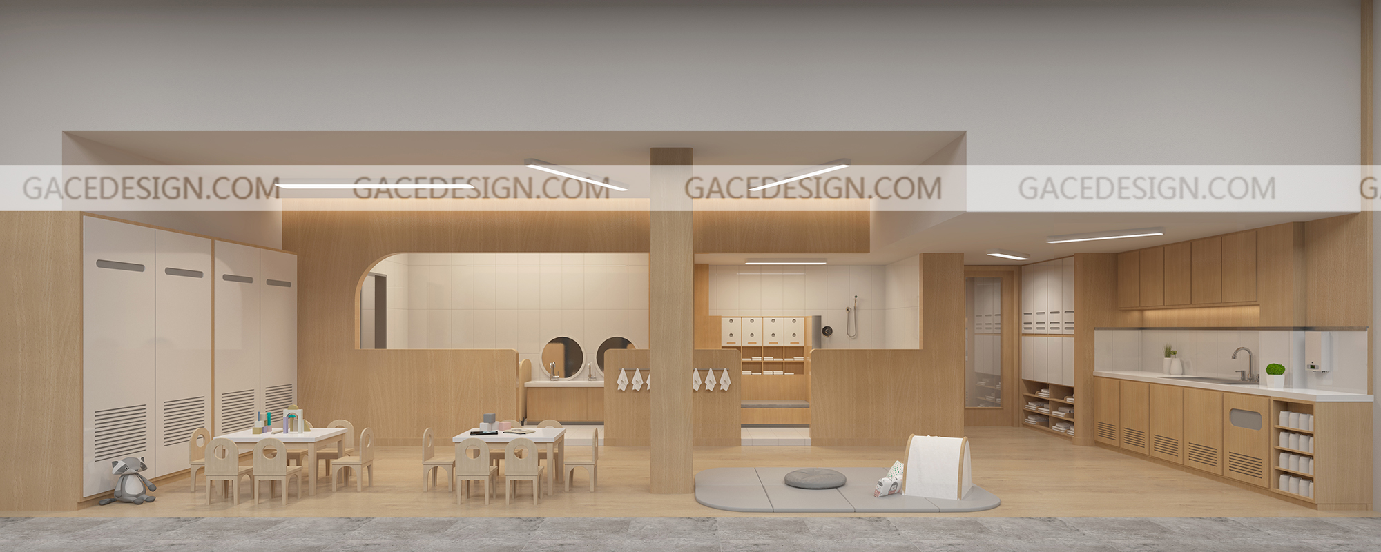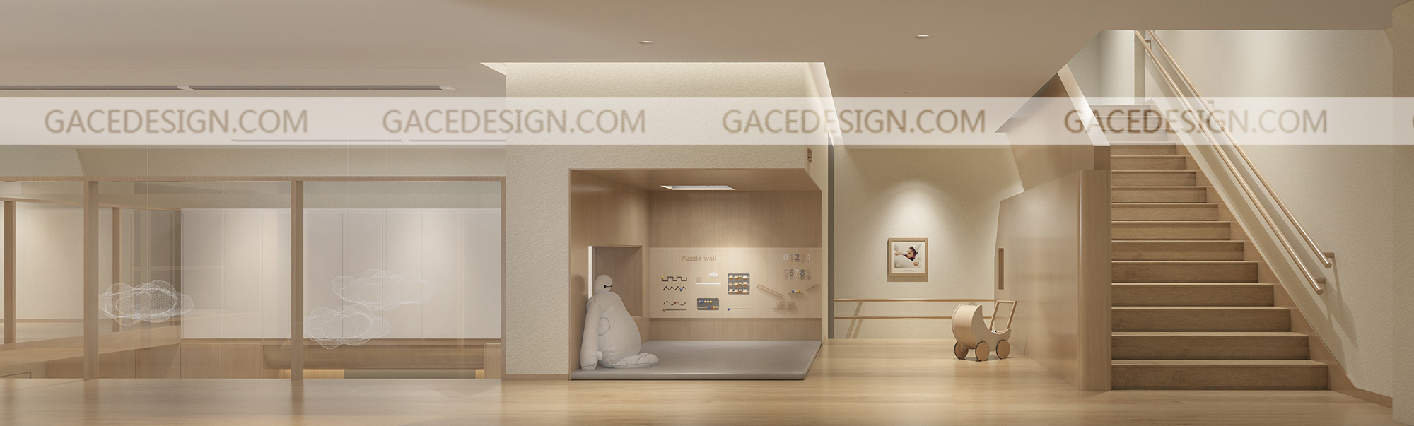 從前廳入口,我們設(shè)置了一個門廳,孩子就像回家一樣,在門廳處就完成了換鞋和洗手的功能,孩子有專屬的換鞋凳和鞋柜??臻g造型上我們進行了簡化,保留了原有的層高,讓陽光最大程度的映入空間。在前臺處我們還設(shè)置了孩子尺度可觀賞的魚缸。在空間基調(diào)上我們選擇了柔和木質(zhì)材料與自然光線的映射,使空間呈現(xiàn)明快輕松的氛圍。為了讓孩子自己與環(huán)境互動,我們在一層設(shè)置了一個空曠的空間,孩子們能夠在這里安全的爬行和玩耍,我們根據(jù)不同年齡段孩子的需求還設(shè)置了不同的區(qū)角,益智區(qū)、繪本角、涂鴉墻和感統(tǒng)區(qū)等等。在樓梯閣樓中我們加入了更多可互動性的功能。通過墻上的樂高墻壁,區(qū)域角的閱讀小書屋,攀爬區(qū),滑梯,涂鴉墻。除此之外教室設(shè)計應(yīng)充分的考慮孩子們的尺度和保育員的保育便捷和操作性。我們在項目中嘗試探討空間與兒童的探索關(guān)系。努力營造一種孩子可以自己發(fā)育成長的環(huán)境模式。