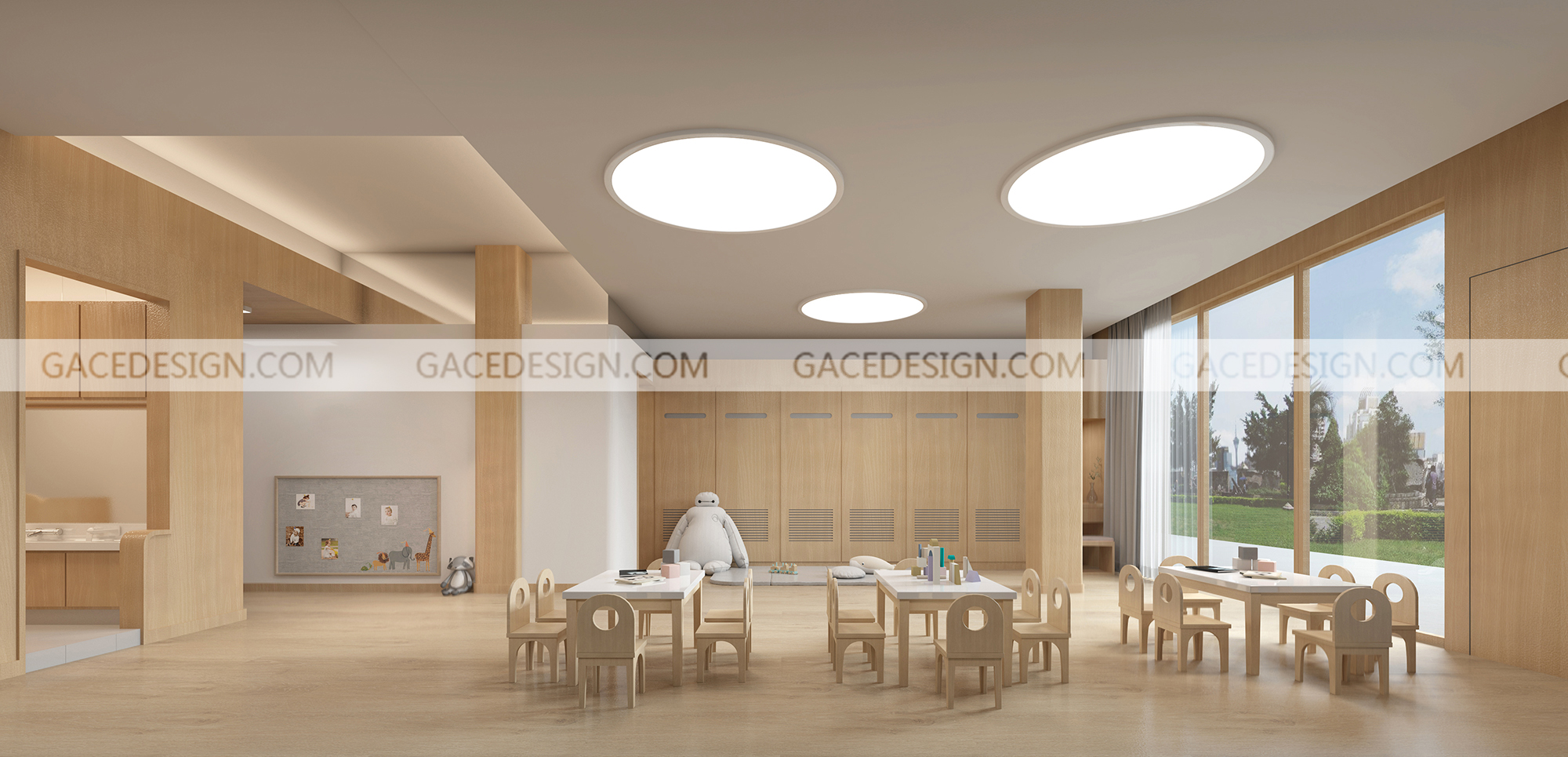 設(shè)計(jì)思考:首先擺在我們面前的是要解決通風(fēng)和采光問題。作為家長對于空間的要求,除了安全以外,最在意的就是通風(fēng)和采光。在室內(nèi)采用了兩種視角,即成人和小孩的視野,場地一共設(shè)計(jì)了4個托育班,1個科學(xué)育兒指導(dǎo)區(qū),其他均是配套功能等。讓成人亦可投入這個兒童空間,真正地塑造出能讓人安心的空間。新空間在視覺上更加開闊,前廳均有充足的自然光線,環(huán)境明亮且溫暖。從前廳過道到科學(xué)育兒指導(dǎo)區(qū),是一個眼前一亮的開放性空間。純凈的室內(nèi)空間讓孩子們擁有更多創(chuàng)造的空間。這里能提供街道和社區(qū)科學(xué)育兒指導(dǎo)站建設(shè)指導(dǎo),為街道和社區(qū)指導(dǎo)站運(yùn)作提供支持。所以該空間需要一定的活動面積,需要承載開展活動、爬行、感統(tǒng)區(qū),游樂繪本等互動性功能。我們試圖打破這種室內(nèi)外一刀切所帶來的生硬的邊界感,通過設(shè)計(jì)我們最大程度的把陽光帶給教室,讓教室形成豐富的多層次視野。配合明亮的落地窗,讓孩子的活動空間更加通透。