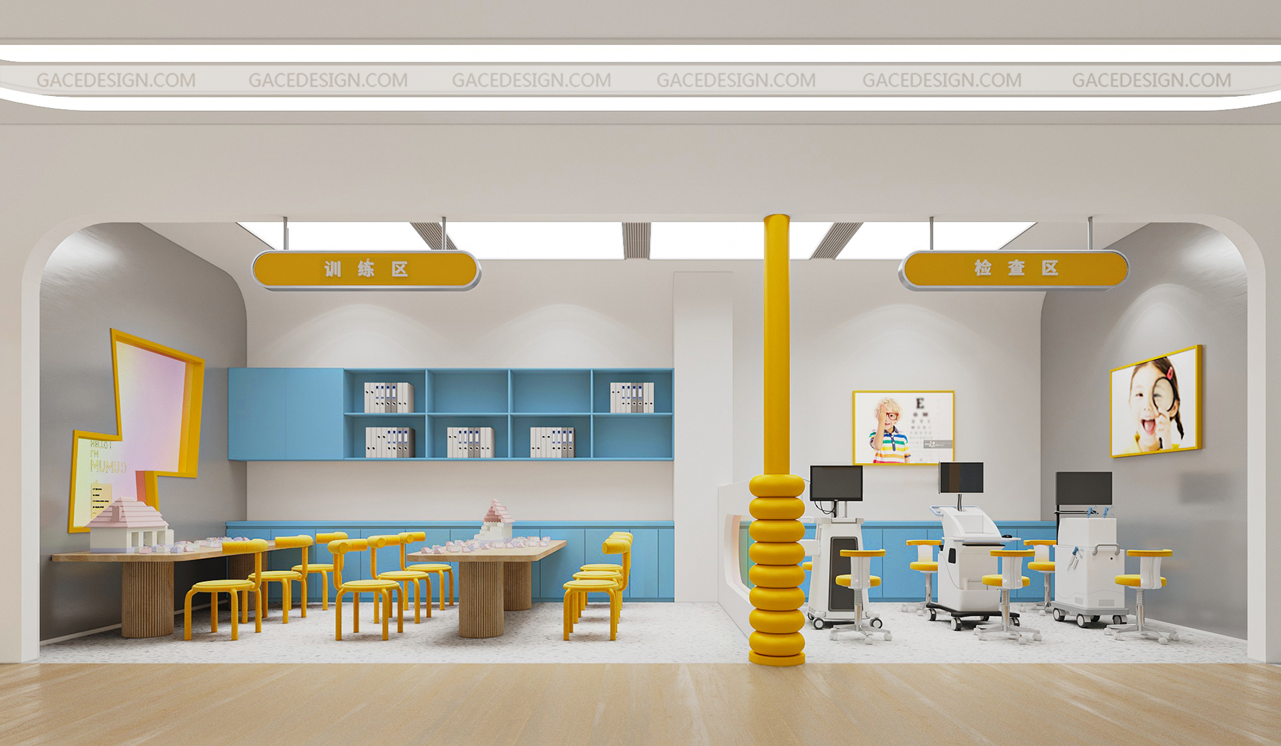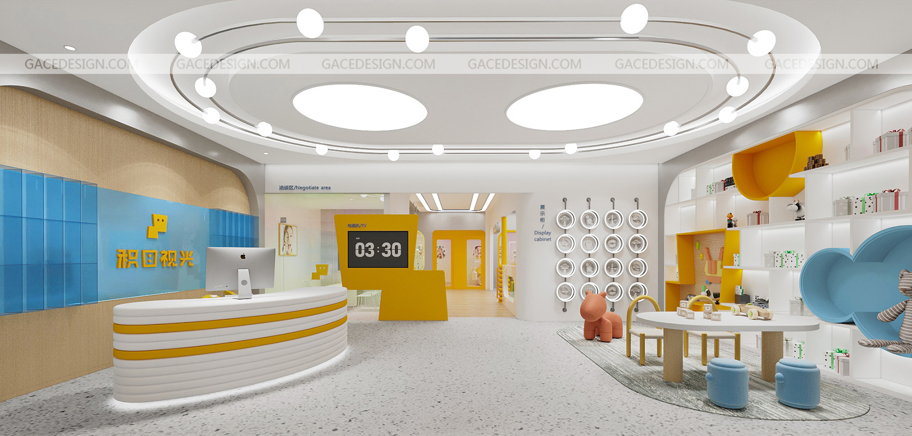 設(shè)計說明:將品牌IP最大化融入到空間。以鮮明的品牌形象色,傳達(dá)了引領(lǐng)行業(yè)趨勢的新理念。友好的圖形具象化,強(qiáng)烈的對比色在市場打出差異化。讓整個場景與兒童體驗起來更生動有趣。,所有的尺寸根據(jù)兒童的人體工學(xué)進(jìn)行搭配。每一個小細(xì)節(jié)都對兒童友好。一切都是圓的,沒有可以撞到的角落。