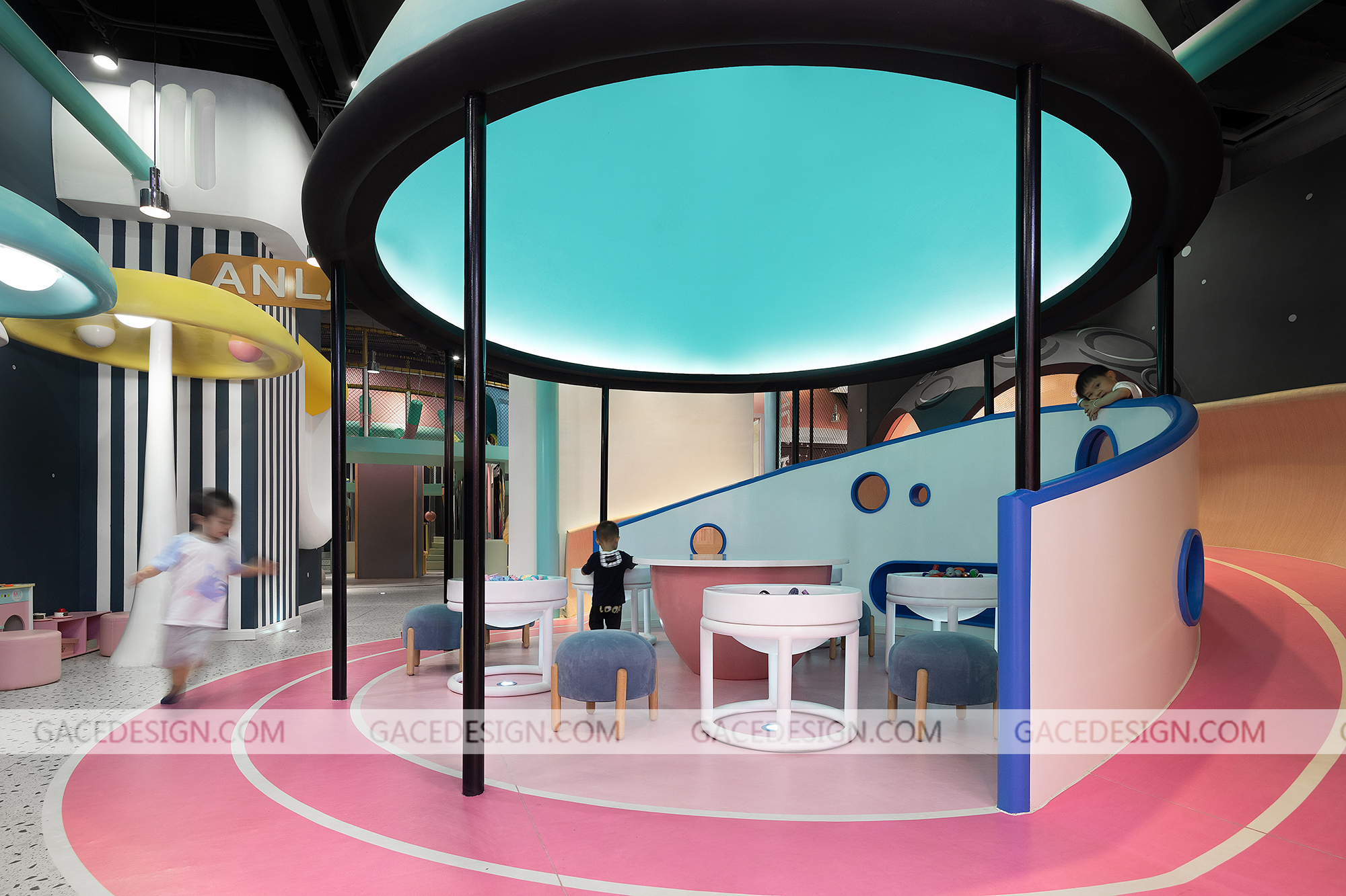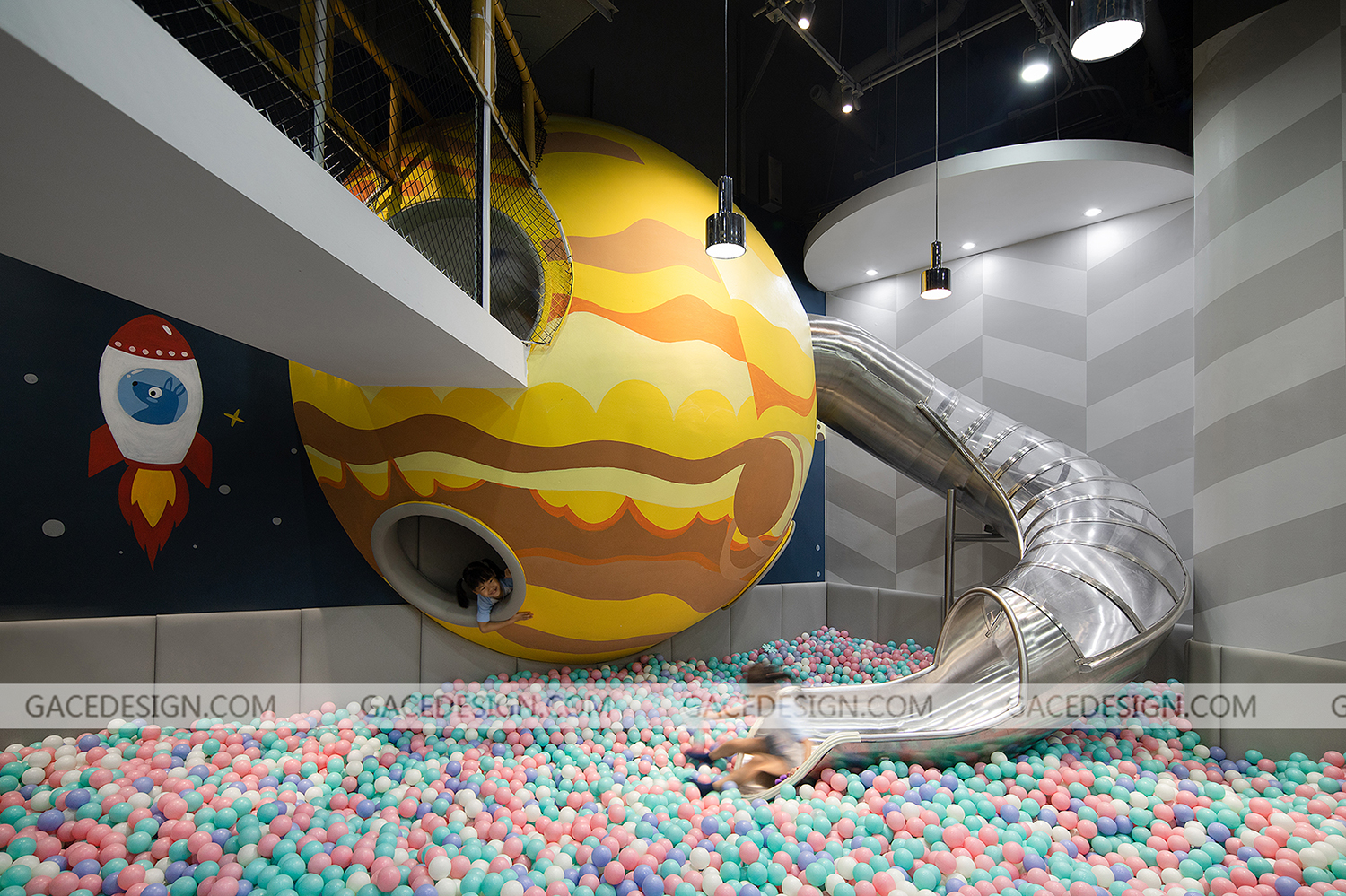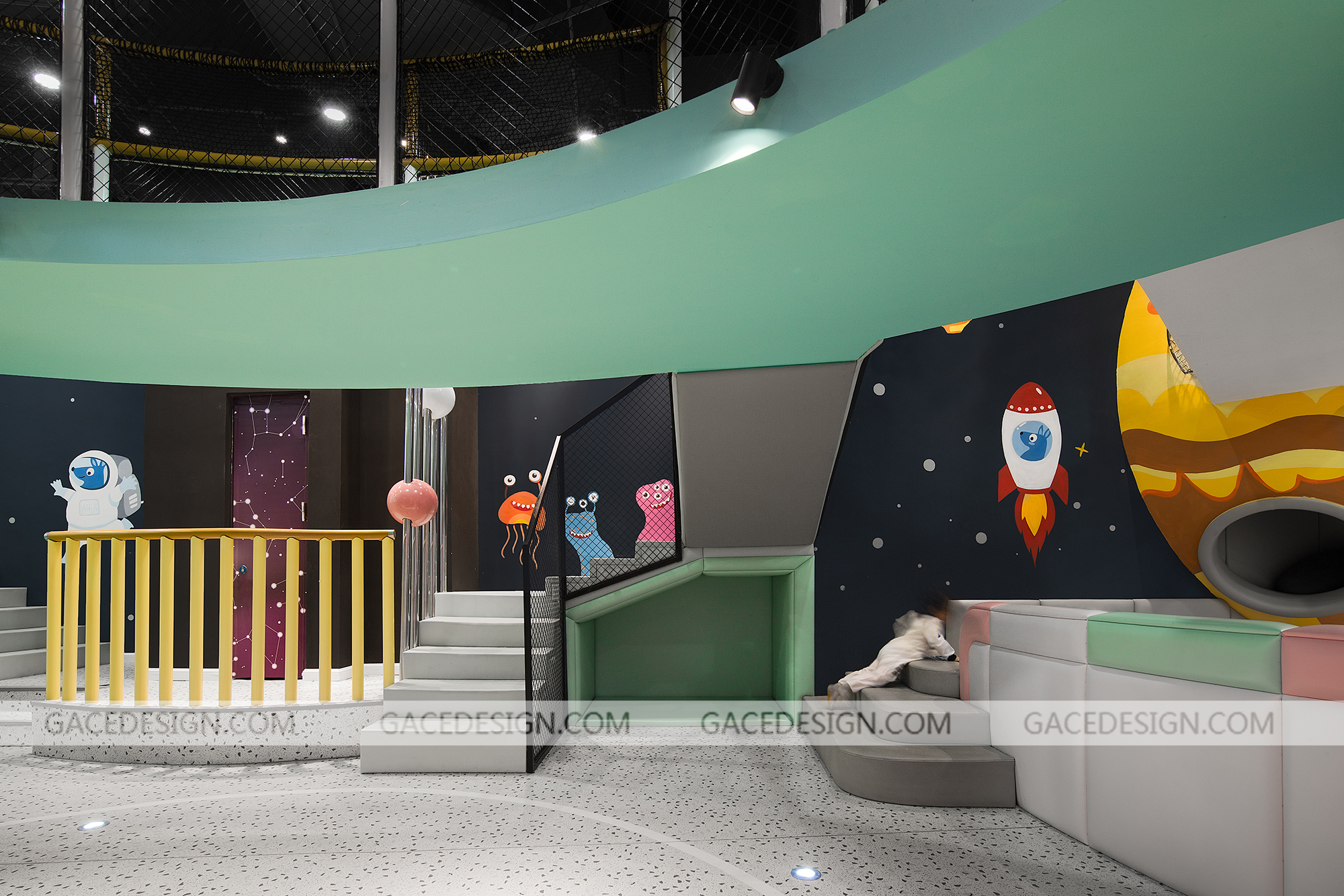 設(shè)計(jì)師將游樂(lè)場(chǎng)主題定為“未來(lái)星球”,以“未來(lái)”作為設(shè)計(jì)方向,以“星球”做為設(shè)計(jì)的核心。各種體量的“星球”在太空中穿行,打造出豐富多彩的星球世界。設(shè)計(jì)師根據(jù)孩子的冒險(xiǎn)精神設(shè)定多種游戲玩法和路線,孩子進(jìn)入游樂(lè)場(chǎng)后,首先需要了解故事背景,在置身其中不斷迎接挑戰(zhàn),最終完成“拯救家園”的任務(wù)。整個(gè)游樂(lè)場(chǎng)分為前端接待區(qū)、中端靜態(tài)游戲區(qū)、后端動(dòng)態(tài)游戲區(qū)。