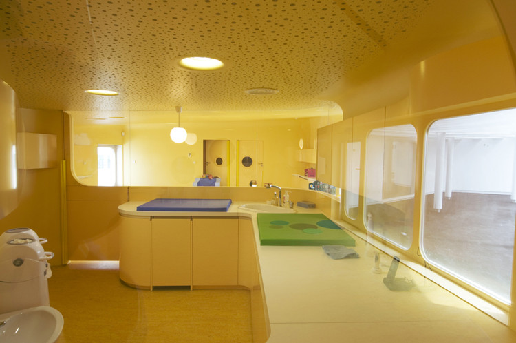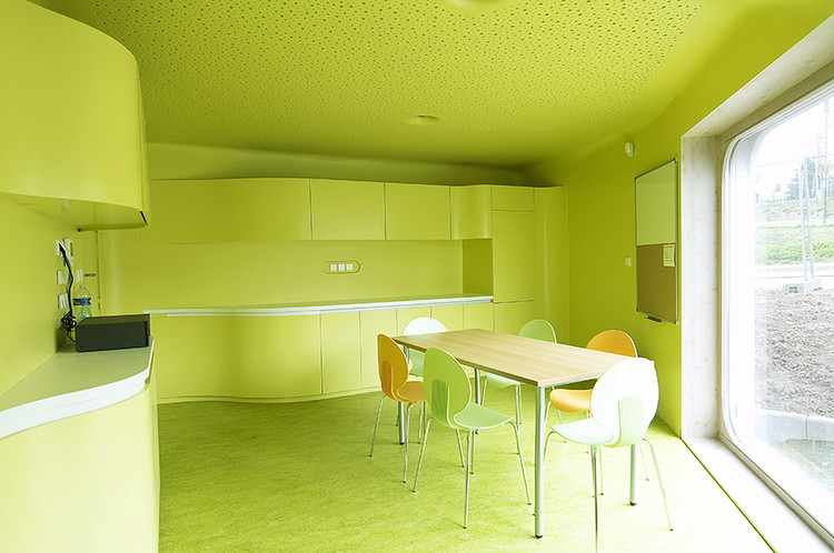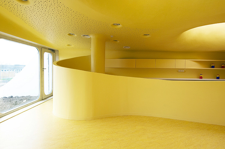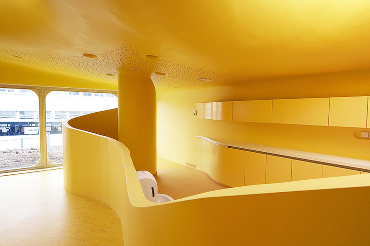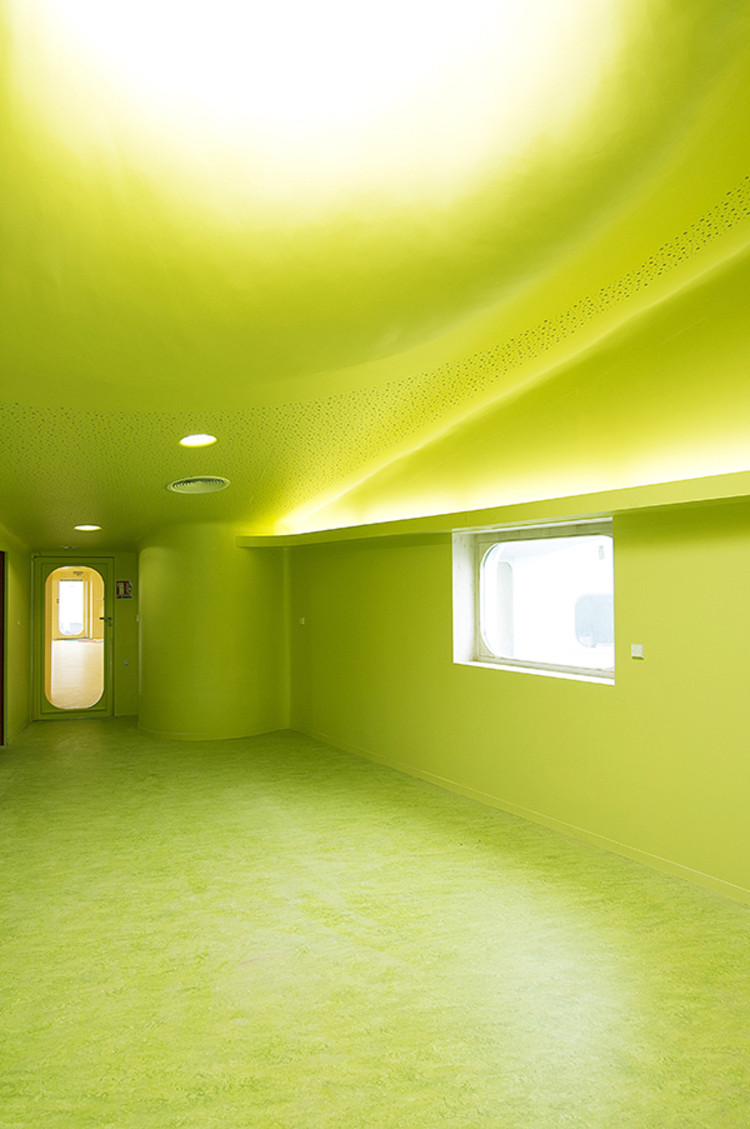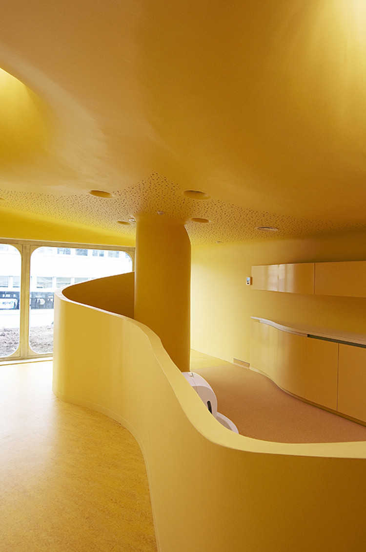 為了保證設(shè)施的安全,所以在內(nèi)部配件的設(shè)計中,消除了所有的直角結(jié)構(gòu),并提供平滑彎曲的邊緣,即使連鋒利的邊緣也被倒圓。這些是該建筑的特點之一,外墻像波浪一樣進(jìn)入了內(nèi)部空間。
