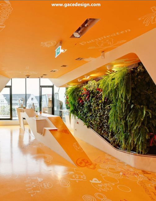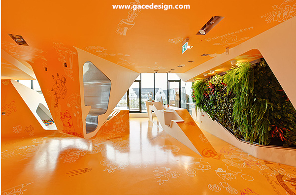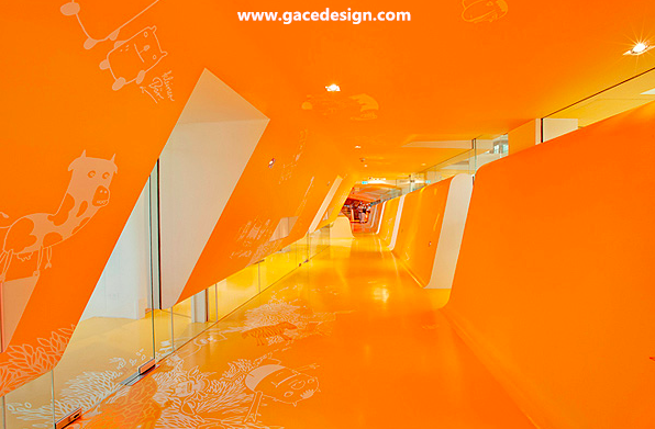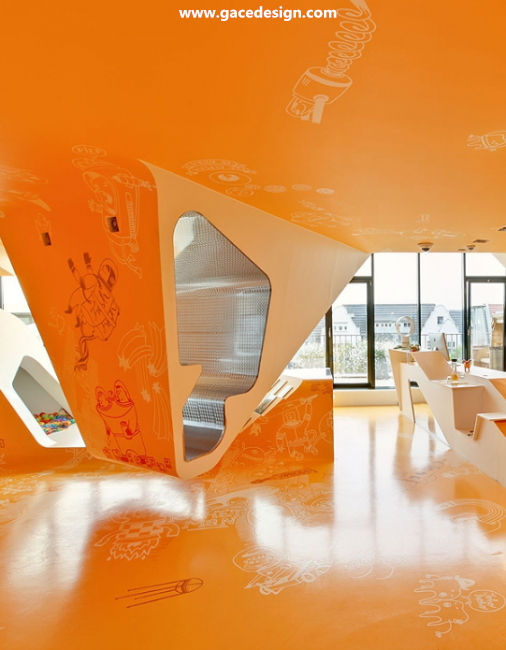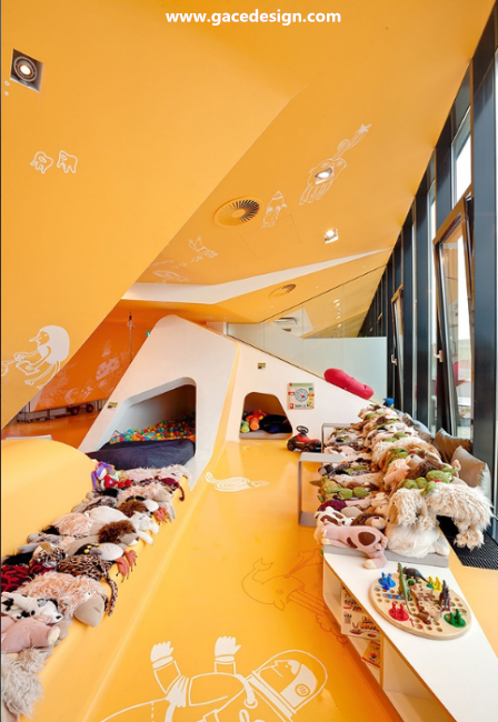 整個KU65 Kids Club的內(nèi)部顏色選用來鮮亮的橙黃色與白色搭配,所有被“切開”的斷面皆為白色。桔黃色的表面上印有各種有趣的卡通圖案與涂鴉,甚至還有類似攀巖的墻壁。很難想象這里竟是一家醫(yī)療保健機構(gòu),所以項目名為KU65 Kids Club就容易理解了。幼兒園設(shè)計