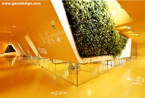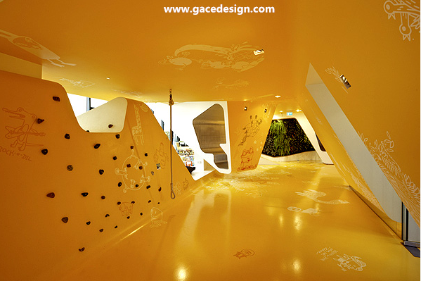 KU65兒童俱樂部位于德國。該項目打破了傳統(tǒng)空間概念,創(chuàng)作出了非常豐富而有趣的室內(nèi)空間。建筑內(nèi)部的地板,墻面和天花板甚至包括家具完全融為一體,仿佛一個有機體的內(nèi)部。豐富的造型激發(fā)著來這里的孩子們的想象力與好奇心,天花板上懸吊下來的空間造型是可參與的,可爬可坐,或者做游戲,總之到處充滿了獨特的空間體會,讓他們很容易便忘記了即將到來的牙科醫(yī)生。