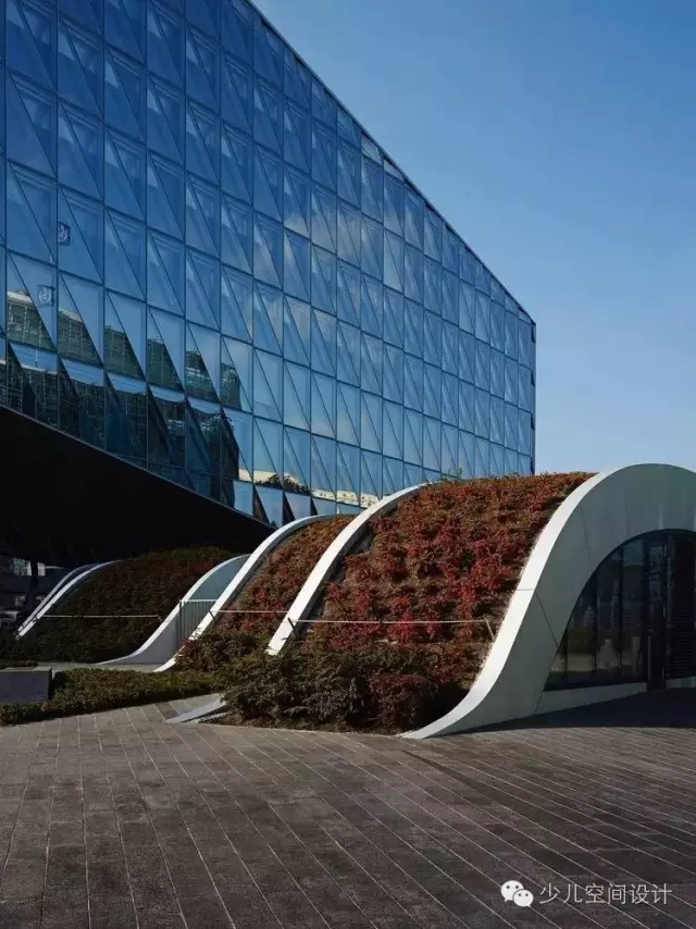建筑所采用的常規(guī)結(jié)構(gòu)及其交替起伏的形態(tài)在基地滿鋪,屋面被植株所覆蓋。這種手法在起伏的凸起部分形成遮蔽空間,凹面下則為室內(nèi)活動區(qū)域。Origami 幼兒園的特殊性質(zhì)源于這種重復(fù)的幾何規(guī)律形態(tài),設(shè)計師運(yùn)用了多種材料:金屬的窗戶豎框、橫梁與木材等。