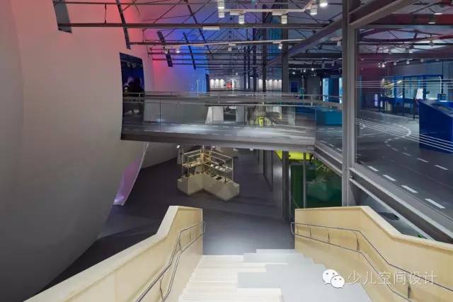 在大廳里,兩個宏大體量較天花板又上升了10米,一個體量繃緊而堅硬,另一個體量柔軟而具有波動性。它們由橋梁相連,人們通過橋梁來回走動。游客會產(chǎn)生“哇”的驚嘆感,并被引入充滿誘惑和想象力的迷人世界,它激發(fā)人們的欲望和好奇心來參與學(xué)習(xí)、探索和創(chuàng)造的過程。