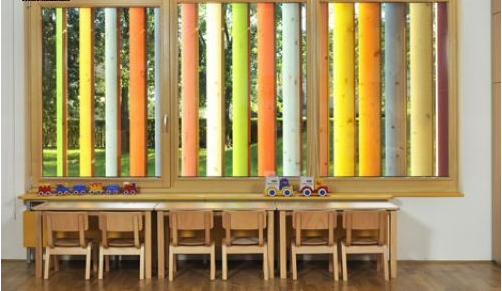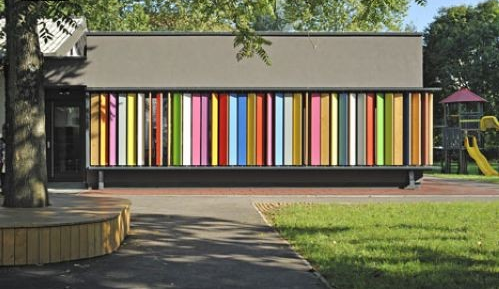 由于周圍社區(qū)兒童數(shù)量的不斷增加,Kekec幼兒園決定擴(kuò)建一間游戲室,由JureKotnik建筑公司進(jìn)行設(shè)計(jì)??紤]到這是一個(gè)為兒童服務(wù)的建筑,因此最重要的設(shè)計(jì)元素就是色彩,除此之外,設(shè)計(jì)師還希望新建筑的樣式更加靈活,融入一些玩具的特點(diǎn),讓孩子們能夠與之互動(dòng),從而增添一些娛樂(lè)性。而實(shí)現(xiàn)以上幾點(diǎn)只需要一個(gè)機(jī)關(guān)——像百葉窗一樣會(huì)“轉(zhuǎn)”的墻壁。