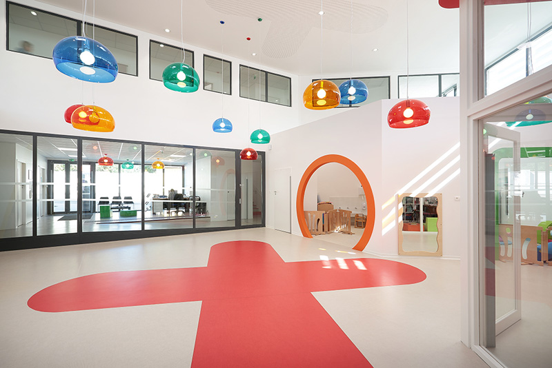 法國(guó)的一個(gè)育兒中心兒童空間,其設(shè)計(jì)非常有意思其特色是上面裝飾著不相同的顏色,和不同的類型玩具相似。