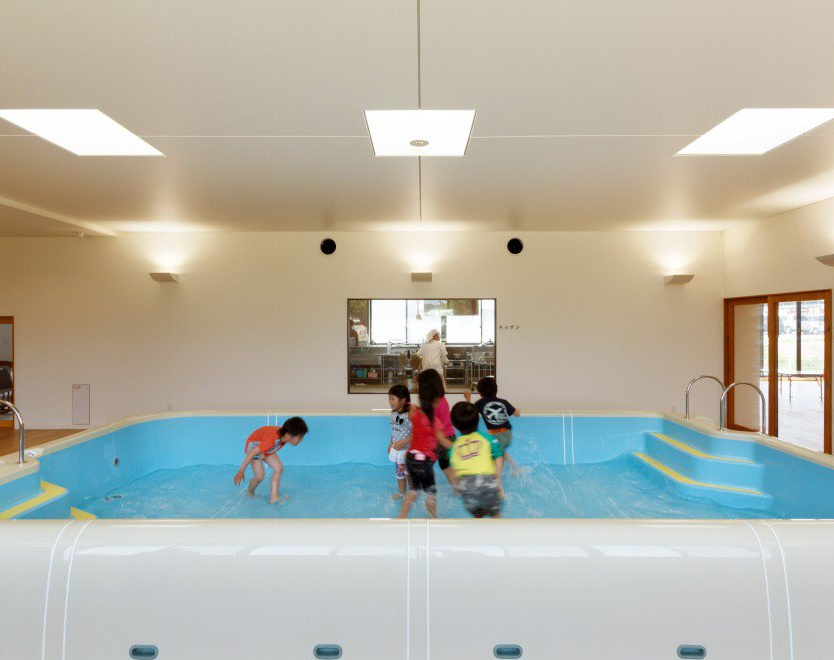 建筑師設(shè)計(jì)了一個(gè)長(zhǎng)而寬的走廊,在這里孩子們能盡情的跑,同時(shí)在室內(nèi)安裝了沙地和水池,他們就能不用擔(dān)心輻射量盡情的玩。一般來說,活動(dòng)走廊的空間與門廊的設(shè)置是一致的,是教室的重要組成部分,但很難成為一個(gè)共享的空間。所以,設(shè)計(jì)師想去掉教室和走廊之間的依存關(guān)系,單獨(dú)設(shè)置各自不同面積的門廊。