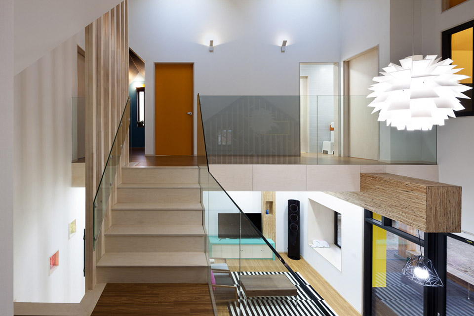 衛(wèi)生間,臥室和兒童房,還有工作室都設(shè)在了二樓。工作室面對(duì)院子,這樣可以讓家長(zhǎng)在一邊工作室之余也能注意到在外玩耍的孩子。整個(gè)房屋以孩子為核心進(jìn)行設(shè)計(jì),創(chuàng)造出有趣關(guān)聯(lián)還有互動(dòng)的室內(nèi)外空間