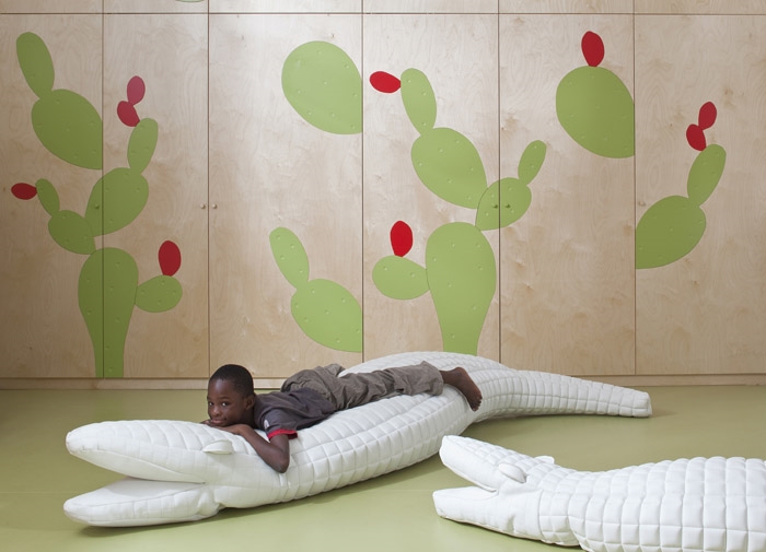在堅(jiān)持富有想象力的創(chuàng)意設(shè)計(jì)時(shí),同時(shí)全面考慮使用對(duì)象,材料方面使用經(jīng)濟(jì)型的PVC地板以及人造革材料,家具方面則是高度符合兒童人體工程學(xué),可以方便去拿玩具,而且還具體的設(shè)了有病床、蘑菇、房子、廚房、烤箱等等大玩具,可以讓孩子們?cè)诶锩孢^(guò)足扮家家的癮,每一個(gè)細(xì)節(jié)都做了考慮,蘑菇、木房則可以讓孩子們藏在里面能讓孩子們能得到更多的體驗(yàn),發(fā)揮想象力。