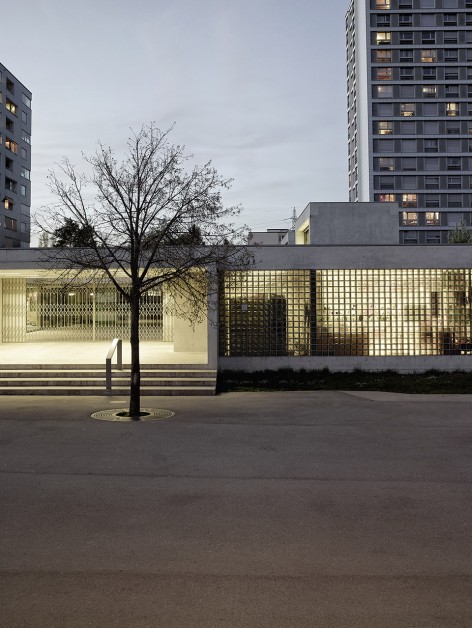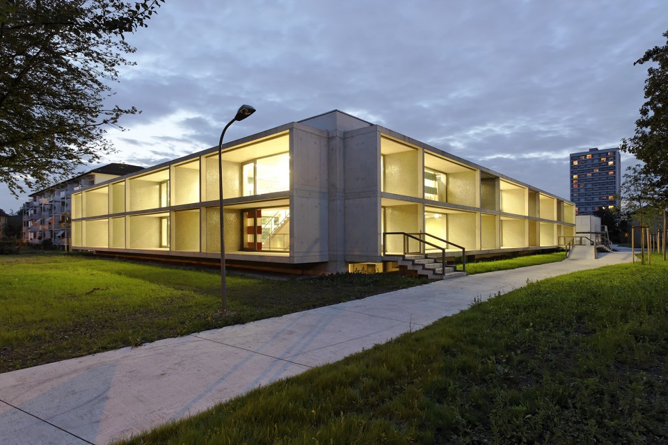 位于瑞士蘇黎世Hirzenbach區(qū)域的城市結(jié)構(gòu)如同花環(huán)般層次分明,外圍的公寓樓高低起伏,環(huán)繞著中間開闊、平坦而低矮的學(xué)校建筑。而由Basler & Hofmann事務(wù)所所新建的建筑意在加強(qiáng)現(xiàn)有城市肌理的邏輯關(guān)系,在學(xué)校的北面建起了一座僅僅有一層高的幼兒園,而南邊的半下沉體育館則充分考慮了其作為開放性公共空間的通透性。