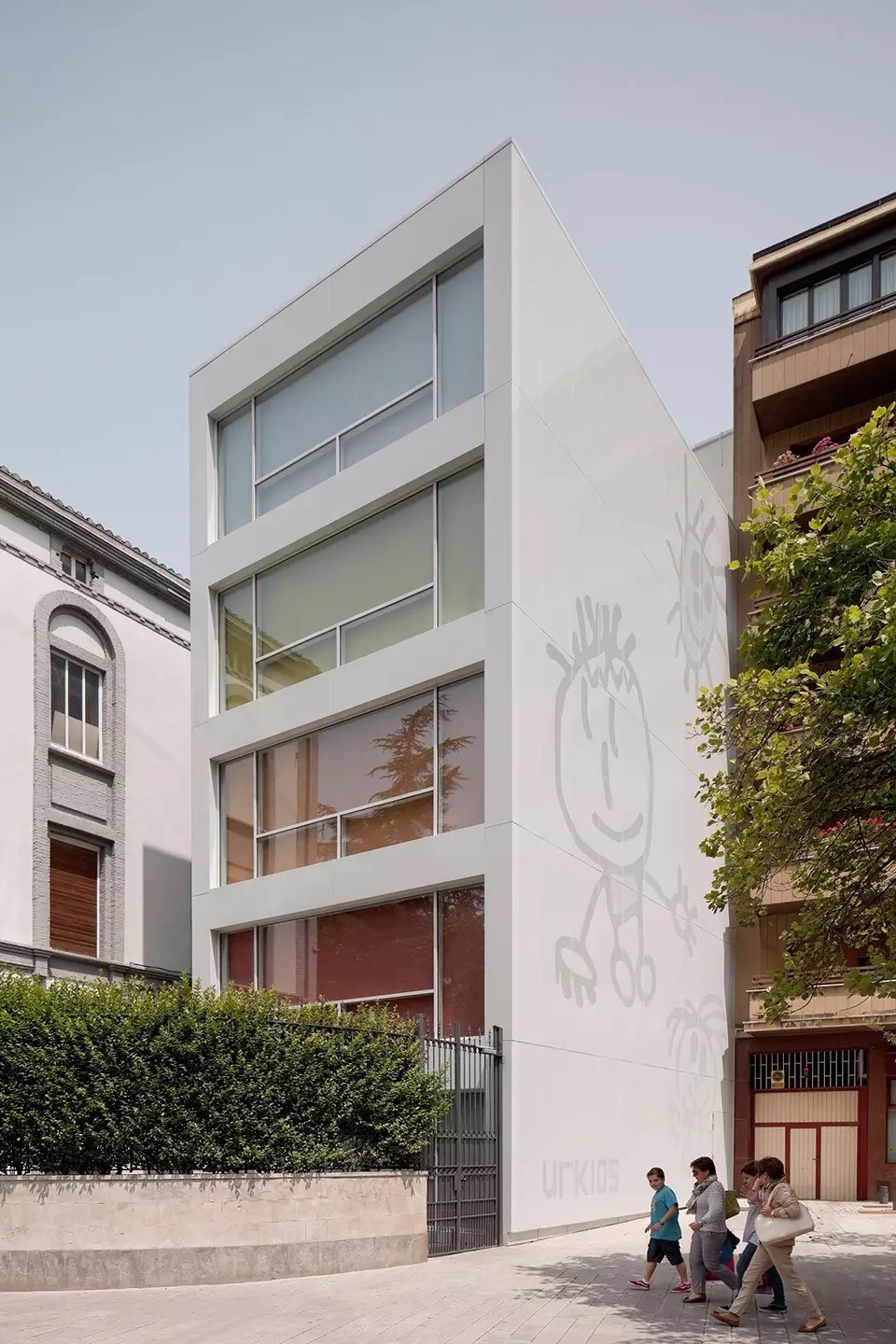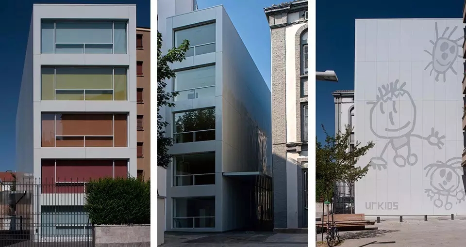 很多幼兒園都是占地面積廣闊,空間很大,但是有一所特別的幼兒園是特例,他就是UrKids幼兒學校,幼兒園是一棟白色五層高樓,就像是人們說的紙片樓,而設計師們則是把入口建在了建筑的長邊上。