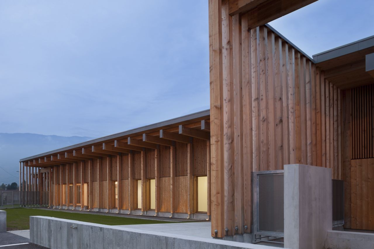 木材因生態(tài)與經(jīng)濟(jì)而被選中。作為自然而可再生的材料,它對健康沒有任何風(fēng)險,同時最大限度減少了碳排放。用于建筑的落葉松木可以采用高水平的預(yù)制,同時無論是建筑立面或其內(nèi)部結(jié)構(gòu)都不需要其他處理。北邊的木結(jié)構(gòu)和天井與混凝土相結(jié)合,從而保證最優(yōu)的保溫性能,同時尊重了防震需求。木結(jié)構(gòu)間充滿了粉刷與亞麻,從而獲得了高性能保溫墻體。建筑的密封性從早期研究到建筑工地都一直得到了重點關(guān)注。