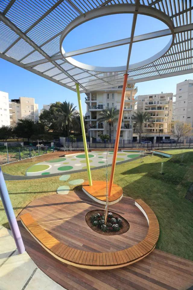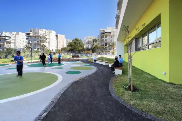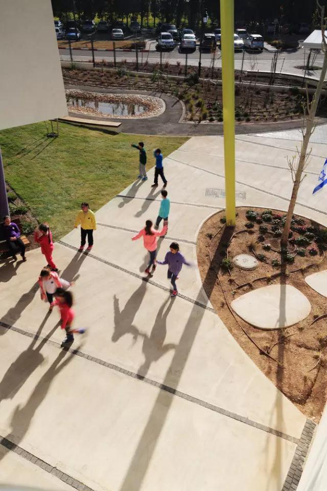 在KRakafot小學操場設計中,“冬日池塘”只是一個綜合綠色建筑的例子。小學有18間教室,是以色列環(huán)境部的一個試點項目,為了未來建設更多類似的生態(tài)型學校。這類學校的額外附加價值是多方面的,包括環(huán)境意識、環(huán)境保護、資源的有效利用、最佳學習條件和環(huán)境教育。學校主路和停車場用可回收石磚鋪成,形成主要的空間,路兩邊坐落著獨立的學校建筑:教學樓、圖書館、行政樓和體育館。主路連接學校的不同區(qū)域。沿著主路,一路種植了楊樹,它們很快會長高,進入藤架的開口,在道路上方提供綠蔭。