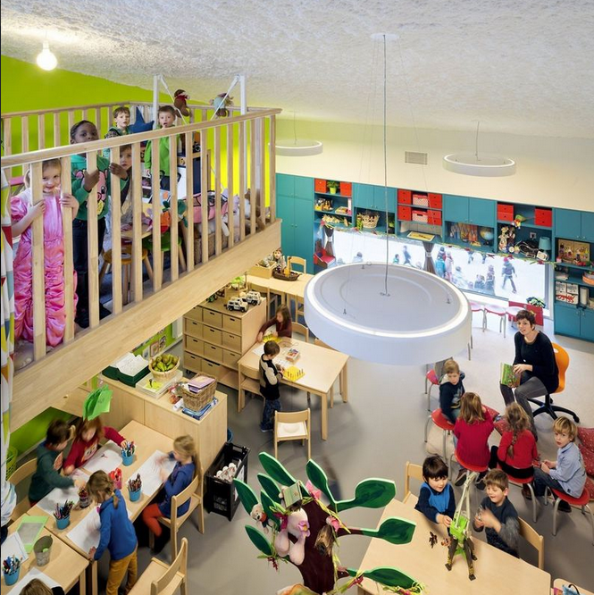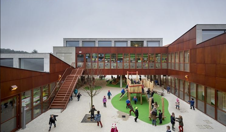 在老建筑和新學(xué)校建筑通過一個(gè)“回廊”相連。這個(gè)“回廊”位于院子周圍,提供通道可以進(jìn)入所有房間。這個(gè)院子容納了操場(chǎng)。小學(xué)建筑也被保留。新老建筑結(jié)合的結(jié)果形成了令人興奮的安全的環(huán)境,適于小孩玩耍和學(xué)習(xí)。(幼兒園室內(nèi)設(shè)計(jì))