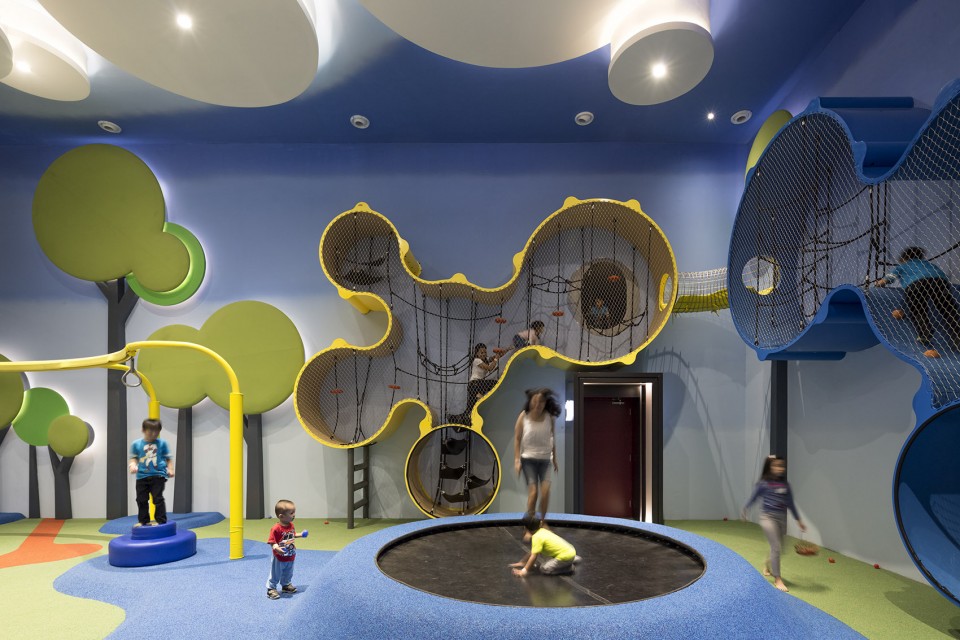 從游戲區(qū)到觀影區(qū)有許多有創(chuàng)意的出入口,需要孩子們?nèi)ヌ剿骱桶l(fā)現(xiàn)。其中一個最刺激好玩的入口是爬到黃色‘Wall- o-lla’樓梯的頂點,通過一個管道滑梯到達(dá)觀影區(qū)屏幕下方的彩色海洋球池中。Cinemaxx 不僅僅是一個游樂場和電影院,這兩者無縫巧妙的融合使一家人在這里愉悅的相處,并讓人在兒童的歡聲笑語中也能很好的觀賞電影。(幼兒園室內(nèi)設(shè)計)