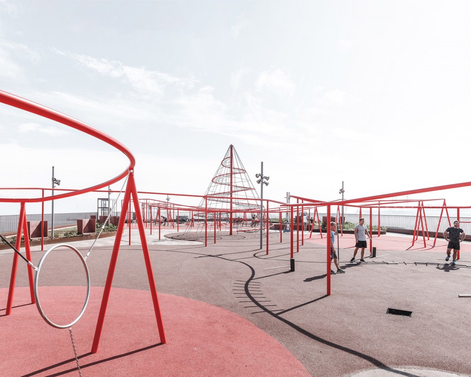 設(shè)計師沒有遮掩而是希望以暴力的結(jié)構(gòu)打破立面,樓層的外部掛著一系列的種植槽,和建筑的結(jié)構(gòu)相呼應(yīng),在給人們創(chuàng)造適宜的空間的同時也把綠色帶到了每個角落,兩條巨型樓梯穿插其中,樓梯之上采用鋼制扶手防護(hù)延綿而上,而轉(zhuǎn)到屋頂之后則是轉(zhuǎn)化為秋千、攀爬架、單杠等等面向各個年齡階層的運動游樂設(shè)施,創(chuàng)造出一個活力十足的公共空間。