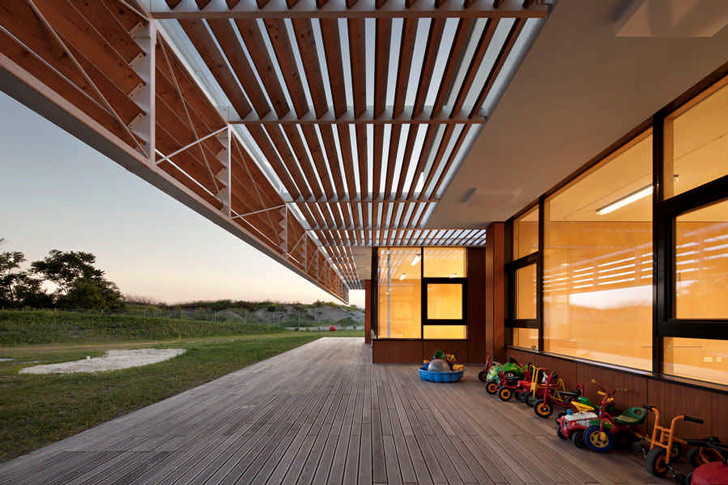 幼兒園設(shè)計(jì)師在設(shè)計(jì)時(shí)充分考慮并側(cè)重于資源利用和環(huán)保概念,整個(gè)建筑采用中控通風(fēng)系統(tǒng),通過(guò)地下隧道引入新鮮空氣,在冬季預(yù)先加熱,夏季則進(jìn)行冷卻。熱水來(lái)自水熱泵,并在戶外花園設(shè)置了雨水蓄水箱。