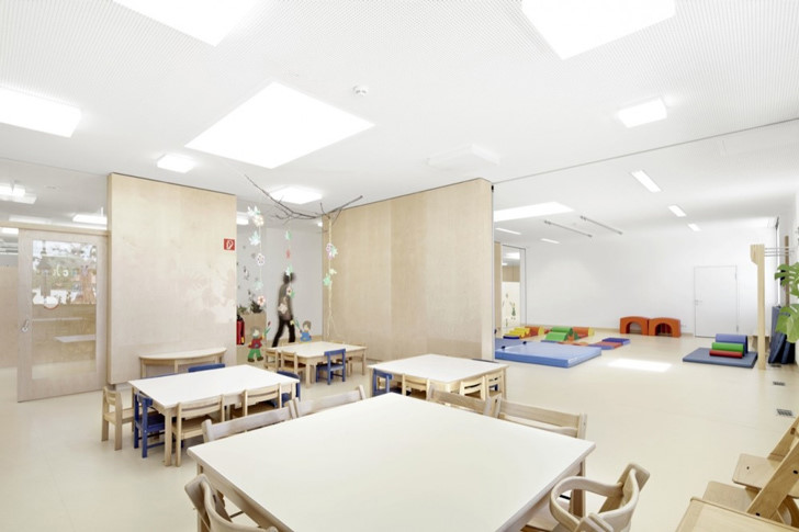 屋頂?shù)脑O(shè)計(jì)和開(kāi)放活動(dòng)室形成一個(gè)新的介于內(nèi)部與外部之間的空間。通過(guò)在南北方向的單位位移,在活動(dòng)室之間形成了視覺(jué)連接效果。這個(gè)專門(mén)為幼兒園設(shè)計(jì)的活動(dòng)室完全可以融入教學(xué)工作中。