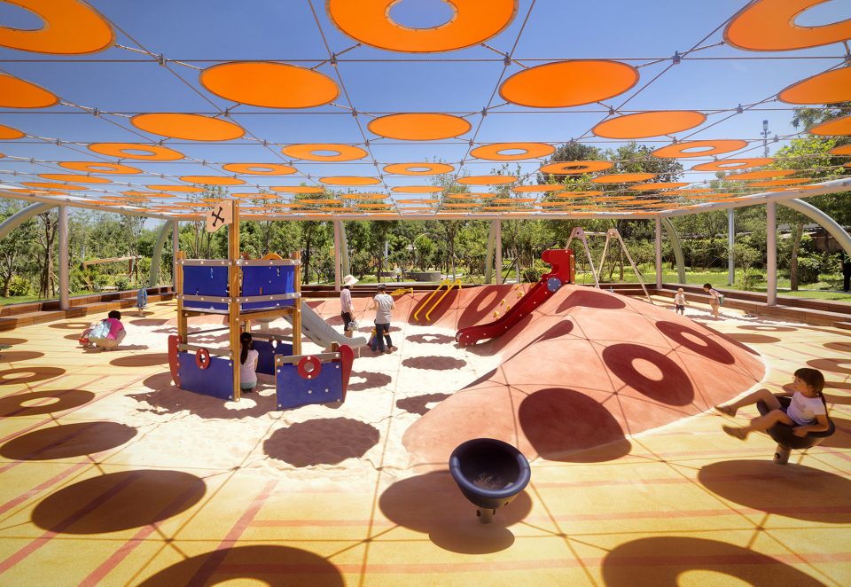 第一個(gè)游樂場是一個(gè)與景觀完美相融合的正方形區(qū)域。這個(gè)場地由木制長椅圍合成一個(gè)微微下沉的地塊空間。這種為家長提供的休憩空間也劃定了場地的界限,為孩子們創(chuàng)造了一個(gè)安全的游戲區(qū),讓他們可以盡情地玩耍。為了進(jìn)一步增強(qiáng)圍合感和保護(hù)感,橙色圓盤構(gòu)成的天蓬懸浮在人們的頭頂上。這些圓盤在柔軟的游樂面上投射了一層棋盤狀的陰影,為孩子們遮擋陽光,驅(qū)逐炎熱。
