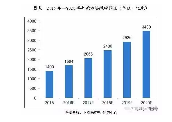 2015年我國早教市場規(guī)模已經(jīng)達(dá)到1400億元左右,發(fā)展速度較快,現(xiàn)階段國內(nèi)早教市場還有巨大潛力尚未開發(fā),隨著家長重視度愈來愈來高,早教的商業(yè)模式日益成熟,早教市場規(guī)模將進(jìn)一步擴(kuò)大,中投顧問產(chǎn)業(yè)研究中心預(yù)測,到2020年我國早教市場規(guī)模將達(dá)3480億元,未來五年增速約為20%。