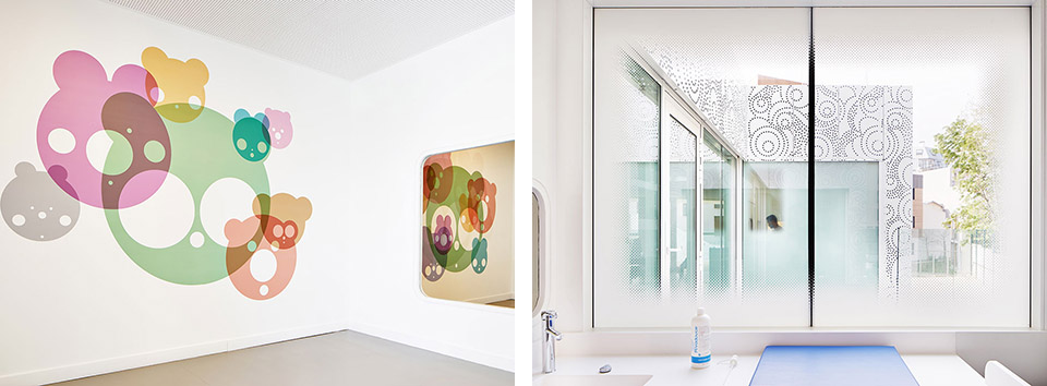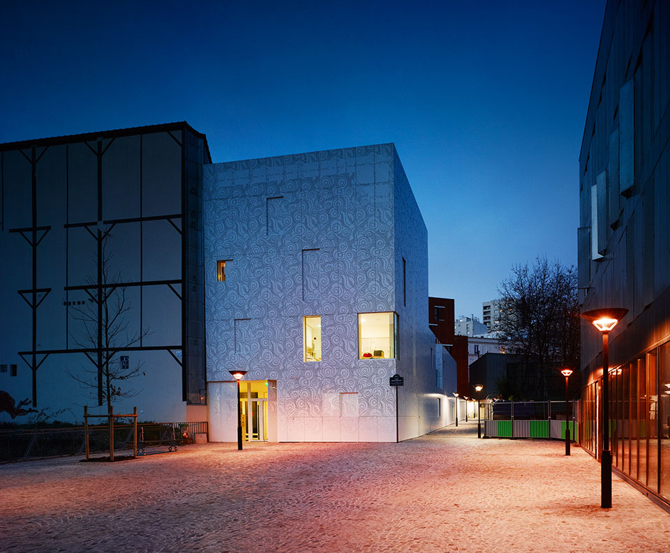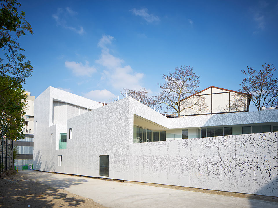 法國(guó)建筑事務(wù)所Avenier Cornejo設(shè)計(jì)的巴黎20區(qū)幼兒園建成,這所可容納66個(gè)孩子的幼兒園是一座獨(dú)特的建筑,為兒童提供安心的環(huán)境。建筑以混凝土為結(jié)構(gòu),滿(mǎn)滿(mǎn)占據(jù)著三角形地塊,并沿兩側(cè)邊緣開(kāi)了三個(gè)內(nèi)庭院,為建筑提供充足的陽(yáng)光與光線(xiàn)。建筑周身覆蓋有著美麗花樣的金屬穿孔板。這層金屬外表皮還覆蓋了部分窗戶(hù),為其提供過(guò)濾的光,并在夜晚像燈籠一樣透光。傍晚來(lái)臨的時(shí)候,兩旁的路燈亮出詳和的燈光,好像都在刻意討好這所幼兒園。它就像一位非常漂亮文雅的姑娘,周?chē)ㄖ吐窡舳际菙≡谒氖袢瓜碌募澥? 此幼兒園的顏色和圖紋,與周?chē)ㄖ氡厥悄敲磁c眾不同,一下子就能夠把人們的目光吸引住了。