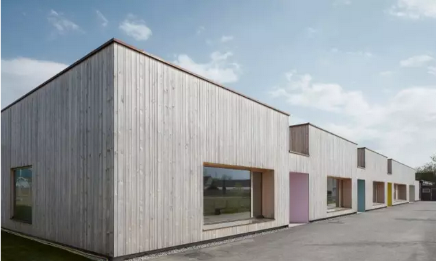 集合少兒設(shè)計機(jī)構(gòu)分享:目前幼兒園正在準(zhǔn)備向東北方向擴(kuò)建,為了尊重原有建筑的設(shè)計并保持與它空間上的聯(lián)系,擴(kuò)建部分與老建筑完全獨立,形成了一個20米寬,65米長的全新木制空間。像毛毛蟲一樣,建筑物用重復(fù)、特定的韻律感在小溪邊展開。外立面垂直的木板條會隨著時間變化而優(yōu)雅地老去,與景觀和諧共存。與建筑一側(cè)的就空間一樣,新的幼兒園使用了同樣貼近低矮的、貼近地面的設(shè)計。每個模塊中間都有大的方形窗戶,在視覺上形成了整體的效果。建筑前部的門廊形成了一個半室內(nèi)的“停車場”,為孩子們的腳踏車和其他游戲提供適合的場地。