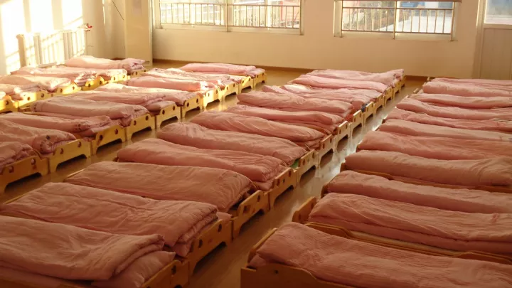 為節(jié)省面積,便于使用,幼兒園床位排列常采用兩床相靠或成組排列方式,但并排床位不應(yīng)超過2個,相接床位不宜超過4個。