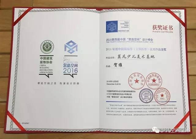 2016年12月,由中國(guó)建筑裝飾協(xié)會(huì)指導(dǎo),CCSD中國(guó)營(yíng)造空間設(shè)計(jì)師俱樂(lè)部、《飾界人物》雜志社主辦,北京大易尚陽(yáng)管理咨詢有限公司承辦,聯(lián)電國(guó)際、輝樂(lè)豪銅門、小狗電器共同協(xié)辦,各地裝飾協(xié)會(huì)、中央電視臺(tái)、中裝新網(wǎng)、瑞麗家居、《建筑技藝》雜志社、《飾界人物》雜志社、中華建筑報(bào)等數(shù)十家媒體聯(lián)合支持的“2016第四屆中國(guó)‘營(yíng)造空間’設(shè)計(jì)峰會(huì)”在北京天倫王朝酒店正式拉開了帷幕。集合設(shè)計(jì)項(xiàng)目“莫凡少兒美術(shù)基地”榮獲此次“營(yíng)造空間”的設(shè)計(jì)金獎(jiǎng)。