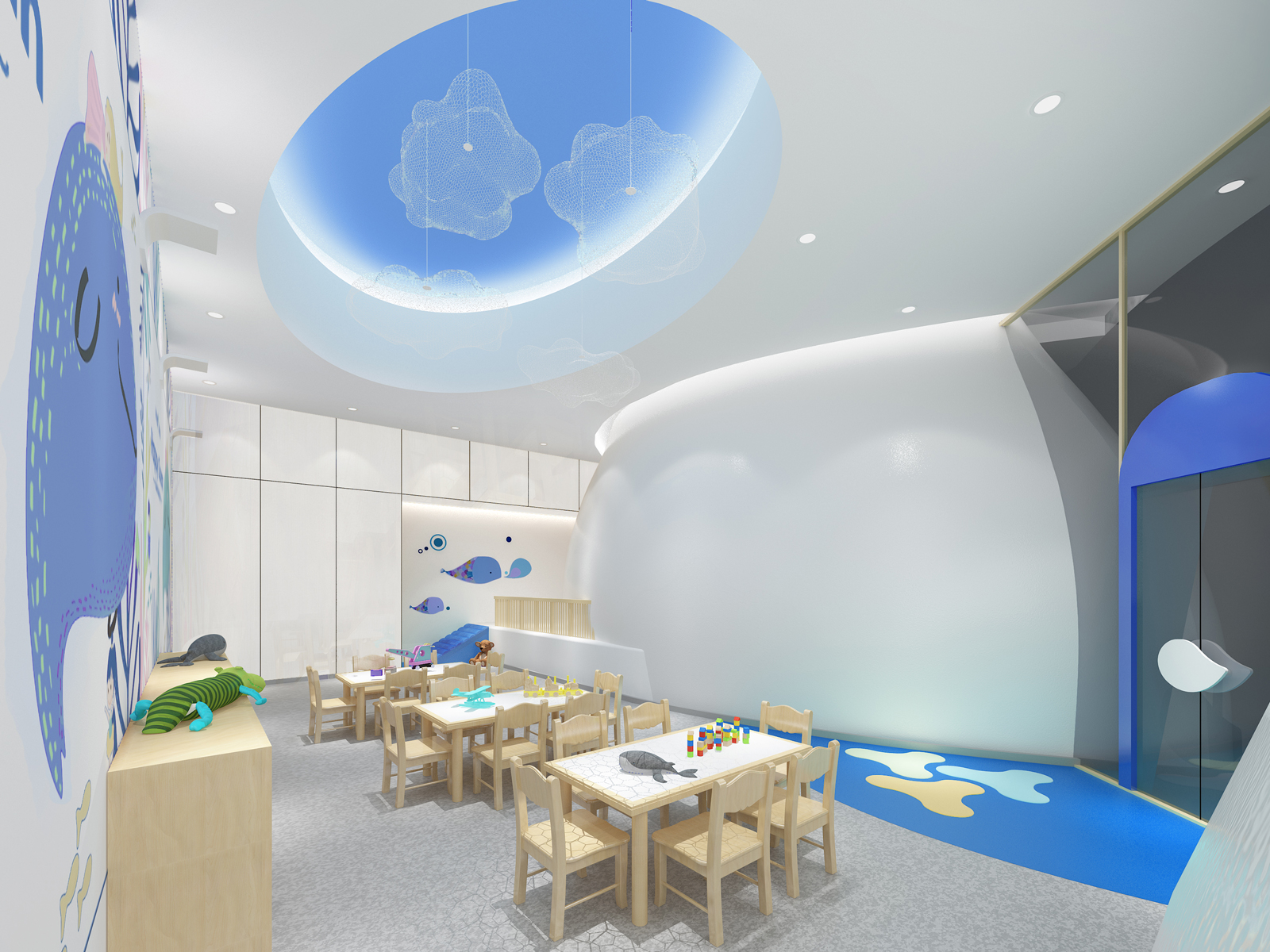 1、在對早教中心進(jìn)行裝修的時候,比較明亮、溫暖,頂面燈光配給,要考慮到兒童的接受光照度來計算。