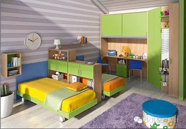 采用綠色作為墻面設計,8平米不到的空間,放置兩張baby床,中間放個床頭柜作為收納。狹小的空間瞬間看起來落落大方。