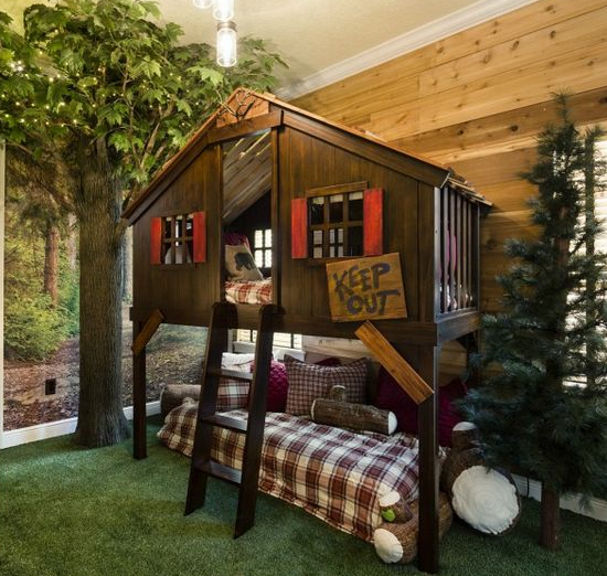 森林風格的設計,一張鋪滿房間的綠色地毯,小木屋的床位設計,下方為休息區(qū),仿佛屋中有屋,滿滿的森林氣息。